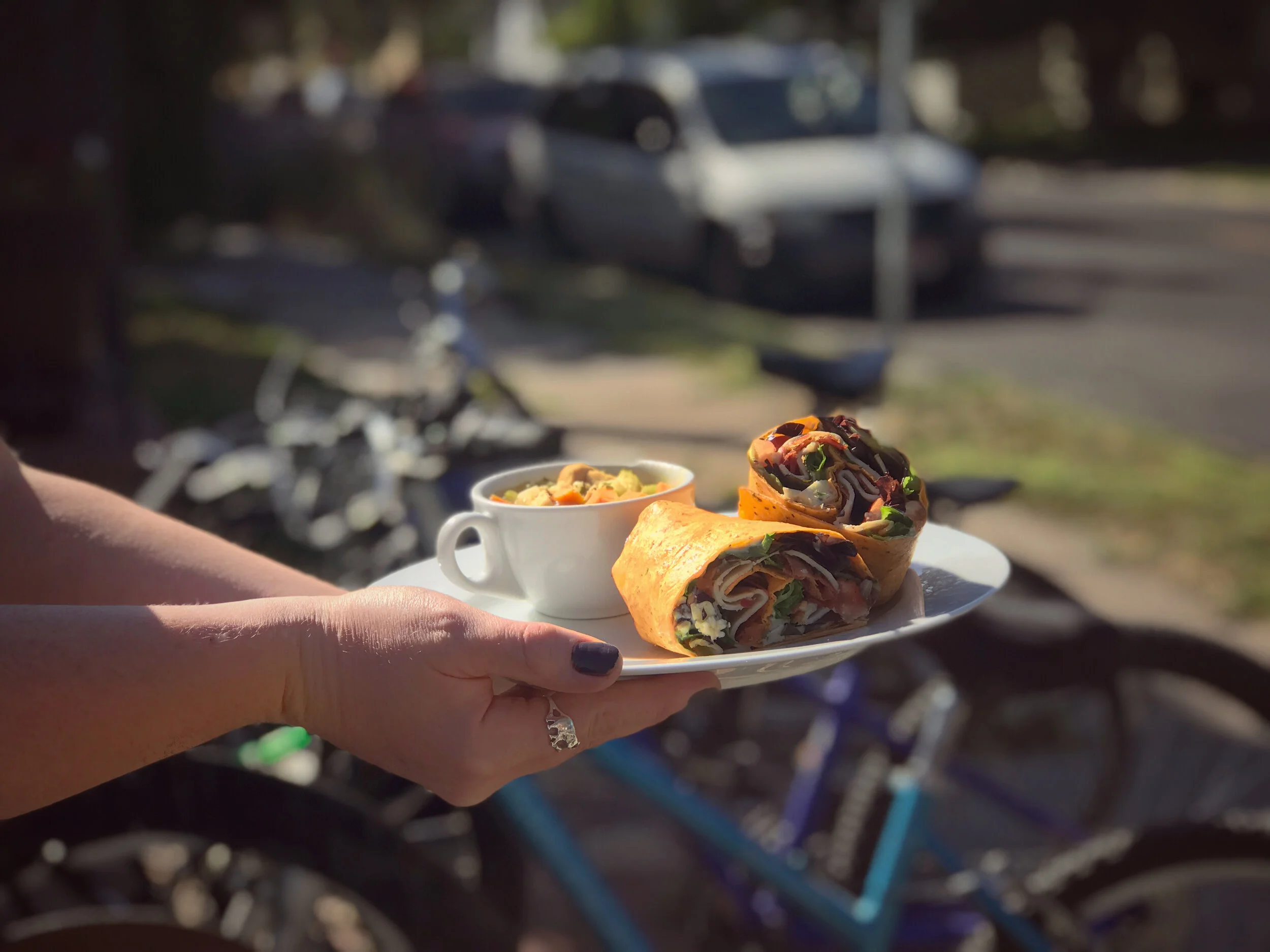 Turkey, bacon, bleu cheese, mixed greens, tomato, & mayo in a tomato basil wrap.